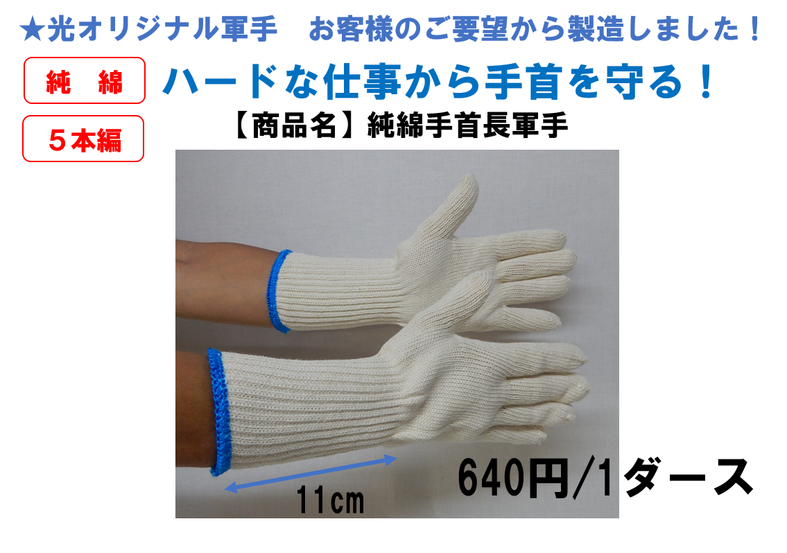 ハードな現場仕事には安全が欠かせません。「手首も保護する軍手はないですか?」とお客様に相談され「ありますよ!」と気軽に応えた私。しかし既存の市場にある商品は丈夫さに欠け、純綿商品は1ダース1000円前後したりとなかなか思うような商品がありません。そこで「弊社でなんとか作ってみよう!」という発想からこの商品「純綿手首長軍手」が誕生しました。お客様は大満足で継続して使用していただいております。ありがたくうれしい話です