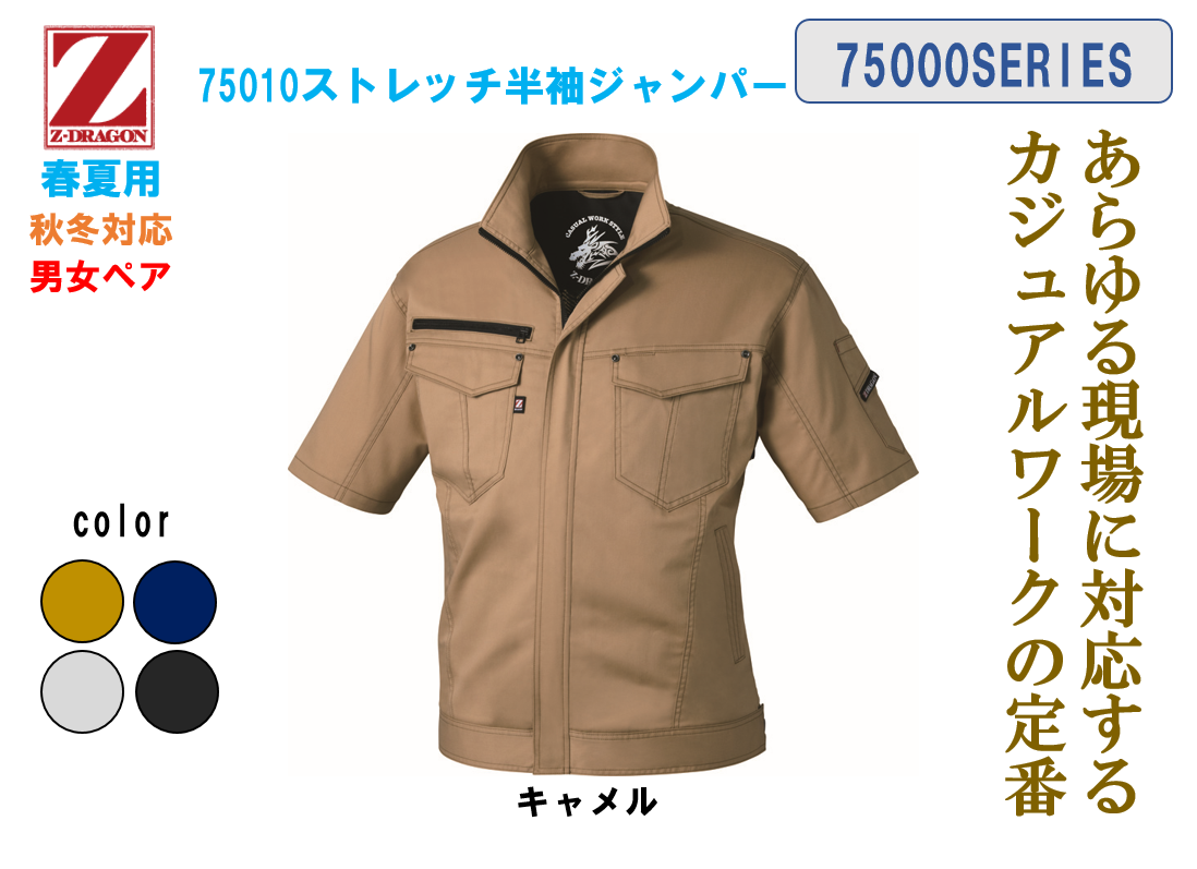 この75000シリーズは自重堂さんのZ-DORAGONブランド立ち上げの頃の商品だったと認識しています。新ブランドの顔的な商品として、メーカーさんの気合を感じる作業服です!