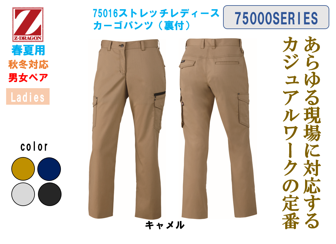 75000シリーズには「長袖ジャンパー」「半袖ジャンパー」「長袖シャツ」「ノータックパンツ」「ノータックカーゴパンツ」「レディースパンツ」「レディースカーゴパンツ」とこれだけ多くのアイテムが揃っています。社内での作業内容によってアイテムを選択する事ができ、かつ統一感を表現できます。女性のパンツは裏付き仕様となってます。