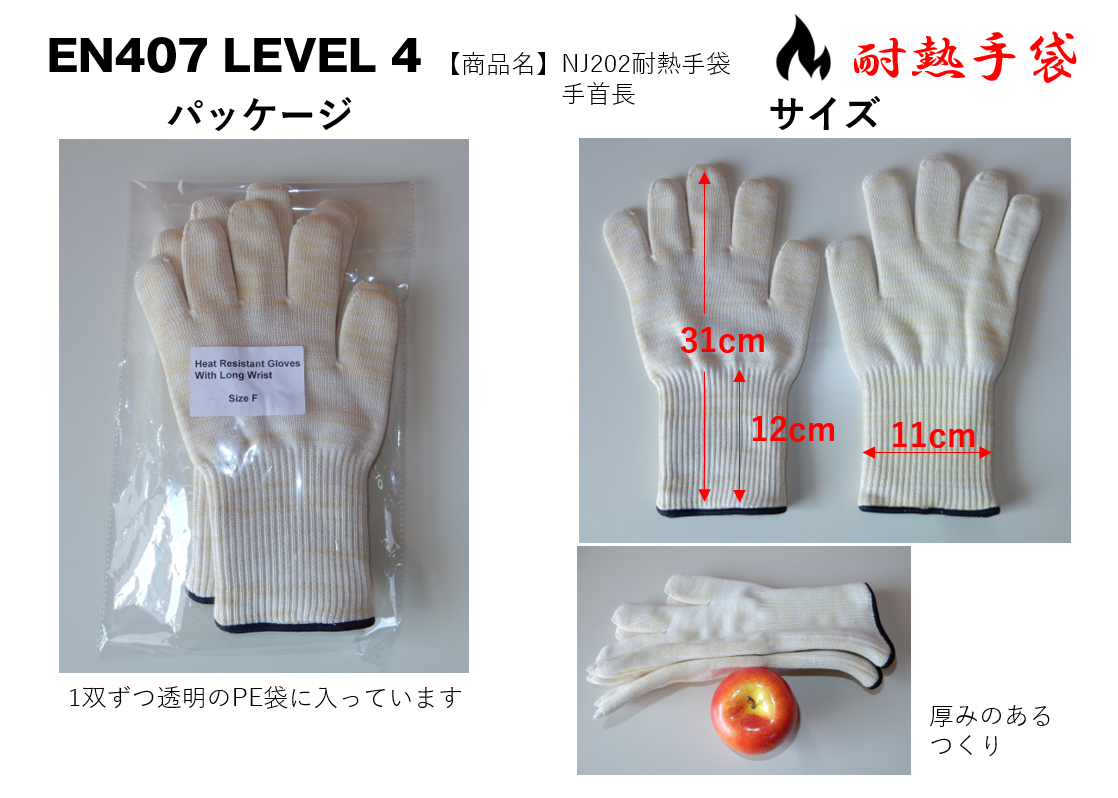 弊社おすすめの耐熱手袋「NJ200シリーズ」は「500℃までの高熱に15秒間耐えれる!」という謳い文句で優れた耐熱性を誇ります。