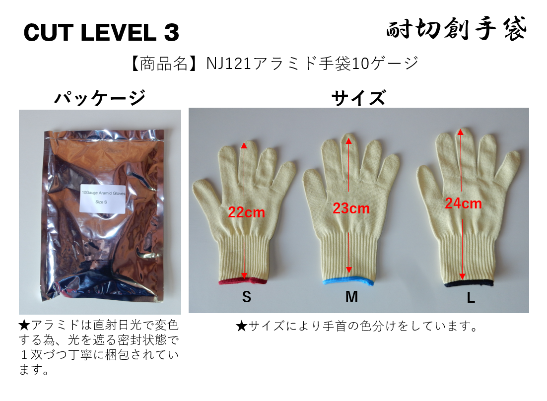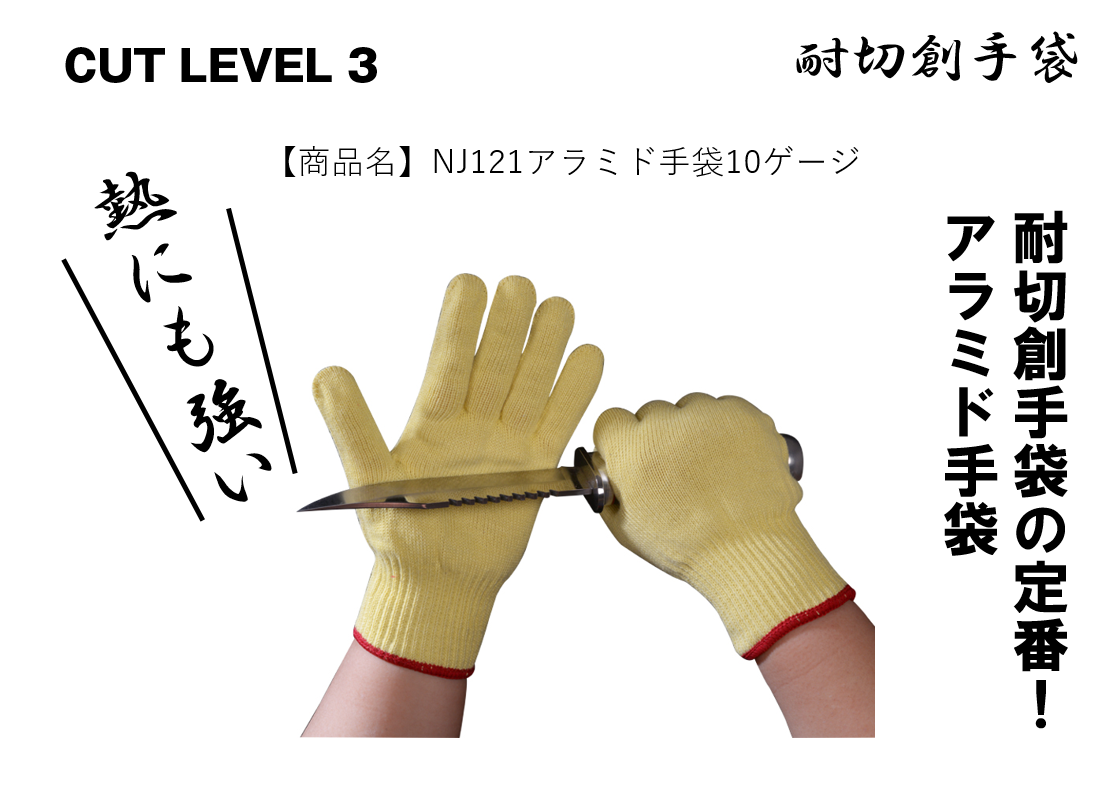 【商品説明】耐切創手袋の定番「アラミド手袋」。10ゲージで編み目が細かく異物の混入を防ぎます。アラミドの特性的に強くて伸縮性、耐久性が高いだけでなく、熱にも強い特徴があります。鋭利物を扱い高熱の作業場などには最適な商品だと思います。