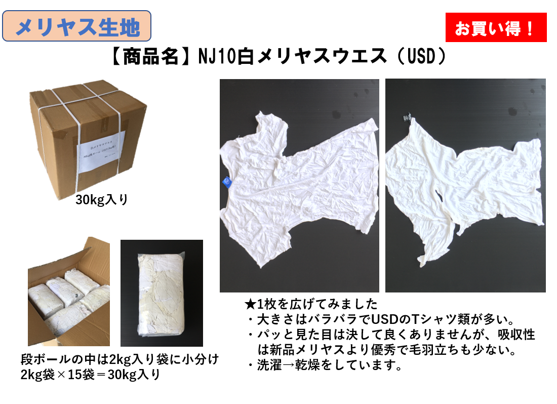 ・白Tシャツなどの古着を、洗濯→裁断→梱包の過程を経て製品としている為、吸収性は抜群です!作業効率UP