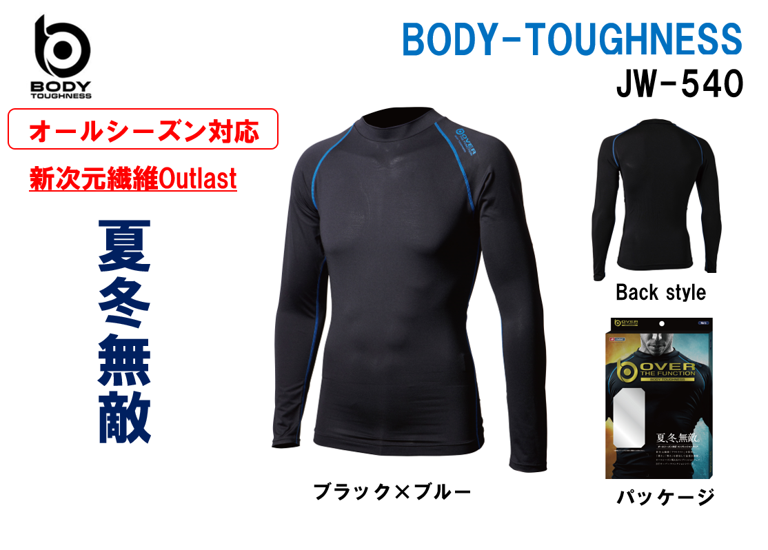 【商品詳細】新次元繊維「アウトラスト」を採用。「暑さ」「寒さ」を感知して温度を調節します。オールシーズン使用できるコンプレッションウェア。BTオーバーザファンクションシリーズ。