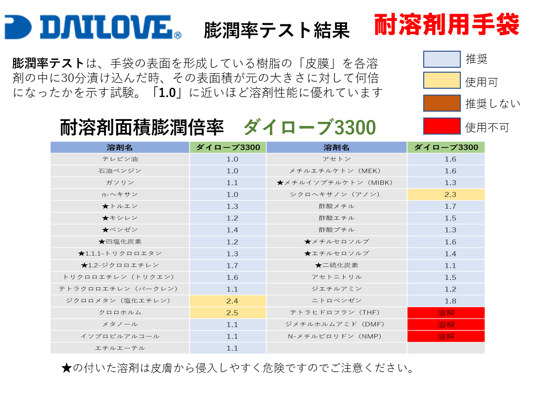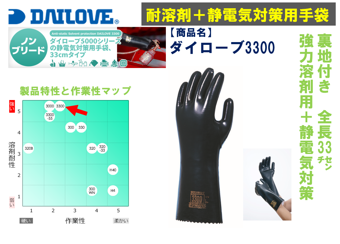 【商品説明】ダイローブ3000シリーズのロングタイプ。より完璧な塗装を必要とする場合に適しています。ノンブリードで手袋を着用したまま塗装面に触れても塗装をはじく心配がありません。また導電性を持たせた特殊なウレタンゴムを使用しており静電気の影響の大きい現場で、手袋により溶剤がはじかれてしまう現場に使われています。